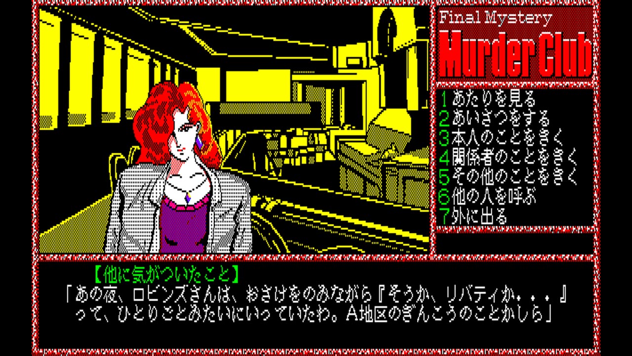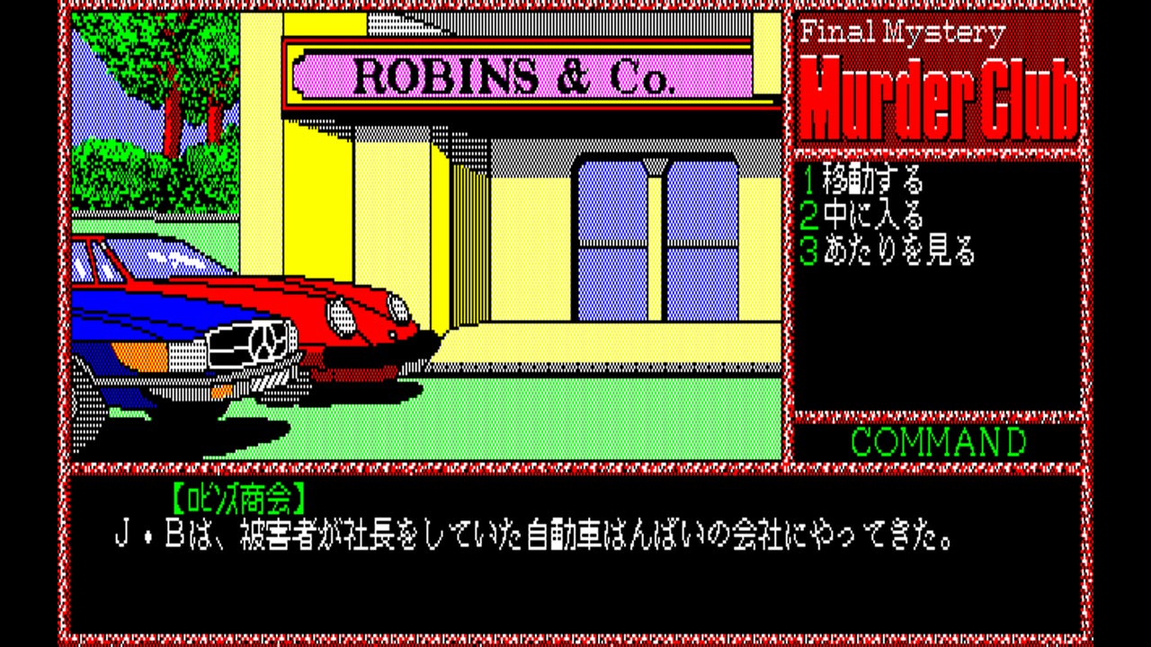 『殺人倶楽部』は1986年にリバーヒルソフトから発売された、コマンド選択方式のアドベンチャーゲームです。プレイヤーは刑事J.B.ハロルドに扮して、事件の解明に乗り出すことになります。