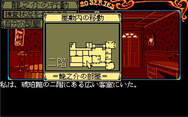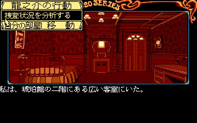 推理アドベンチャーゲームの老舗として知られるリバーヒルソフト。『琥珀色の遺言』は、「J.B.ハロルド」シリーズに並ぶリバーヒルソフトの代表作「藤堂龍之介」シリーズの第1作です。 時代背景は大正時代。セピア色の色調で統一されたアール・ヌーヴォー風の建物や調度品の数々が、プレイヤーを大正浪漫の世界へと誘います。 FM77AVならではの4096色をふんだんに活用した美しいグラフィックスには一見の価値がありますので、既に他機種版をプレイしたことがある方にもお勧めの作品です。