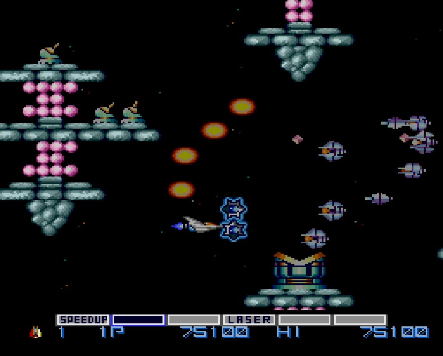 ちなみにレトロゲームファンの間では、MSX版との親和性が高いことで知られ、グラディウスの数ある家庭用ゲーム機移植作品の中で、初めてオプションを4個装備と長いレーザーを再現したタイトルとしても知られています。