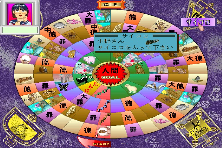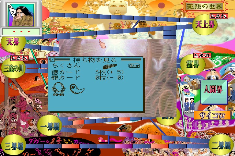 1988年にリリースされたテーブルゲーム。輪廻転生や霊界をテーマにしたスゴロクで、当時は『輪廻転生リバーシブルゲーム』と呼ばれていました。プレイヤーはサイコロを振って駒を進め、様々な生物に生まれ変わりながらゴールを目指します。