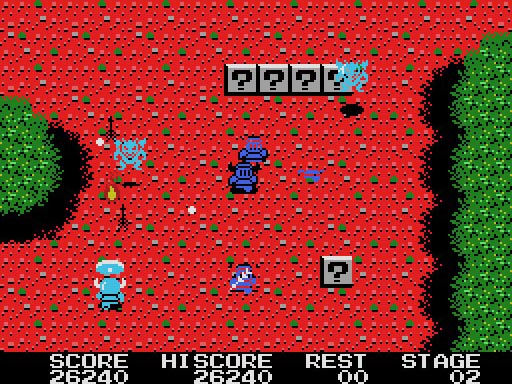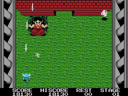 本作は1986年にリリースされたアクションゲーム。プレイヤーは勇者ポポロンとなって、悪の大魔王ヒュドノスを倒し、アフロディテを救わなければなりません。ゲームは8ステージで構成されており、途中で出現するクリスタルをショットして任意の色で獲得することで、得点、スピードアップ、シールドなどの能力を獲得したり、ツインアロー、ファイヤー、ブーメランといった武器を獲得したりできます。また地面に設置された『?』マークのジュエルパワーをショットすれば、様々な宝物が出現してあなたを助けてくれることでしょう。もちろんステージの最後には強力なボスキャラが待ちかまえており、個性的な攻撃でポポロンに襲いかかってきます。手に汗握る戦いが楽しめることは請け合いといえるでしょう。