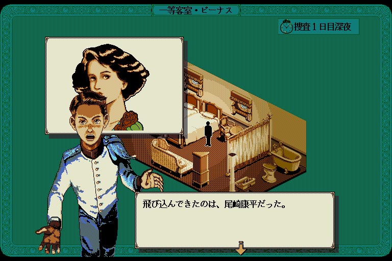 本作ではコマンド選択方式を採用しており、直観的なプレイが可能。航行中の豪華客船という閉鎖された環境の中で。推理を働かせて捜査を行い、犯人を絞り込んでいく、大人のストーリーが楽しめることでしょう。またストーリーの進行とともに次第に横浜に近づくという演出を採用しており、最終的には横浜港に到着しますが……。もちろん、今回の配信はX68000版なのでオープニングなどもきれいなものに仕上がっています。