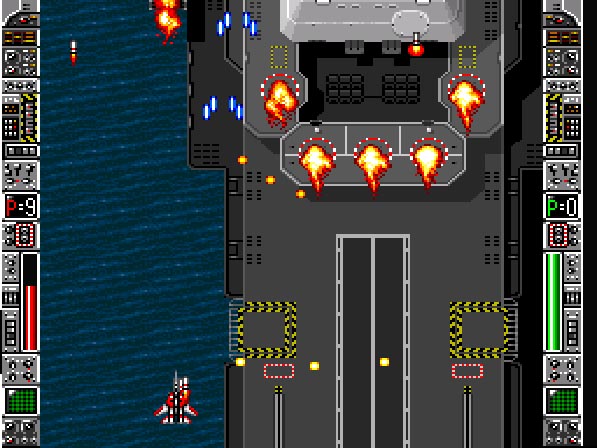本作は1991年にリリースされた縦スクロールのシューティングゲーム。プレイヤーは「F14改ストライクガンナーのパイロットとして、地球の危機を救うため出撃することになります。ゲームは全8ステージ構成で、各ステージの最初に15種類の特殊武器から好みのものを一つ選んで出撃するというシステムを採用しています。特殊武器には、ホーミングミサイル、レーザーといった武器の他、オプションやバリアーなどもあり、ステージに合わせた選択が攻略のカギとなるでしょう。