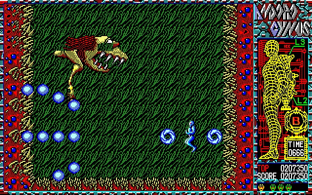 本作は1988年にリリースされた縦スクロールのシューティングゲーム。プレイヤーはアンドロギュヌスを操作して、<URD>を破壊する戦いに身を投じることになります。ゲームは全13ステージで構成されており、各ステージは縦長のマップを下降し、最下層のボスを倒すことでクリアーとなります。
