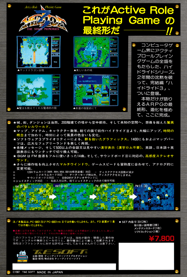 シリーズの続編として前作から受け継がれたグラフィックやサウンドに加えて、職業選択ができたり、世界には時間の概念があったり、冒険中には食事が必要だったり、アイテムの所持重量があるため荷物のマネジメントが必要だったりと、様々な要素をほどよく盛り込んだ意欲作。『ハイドライド』ファンだけでなく幾多のゲームファンを唸らせた作品といえるでしょう。
