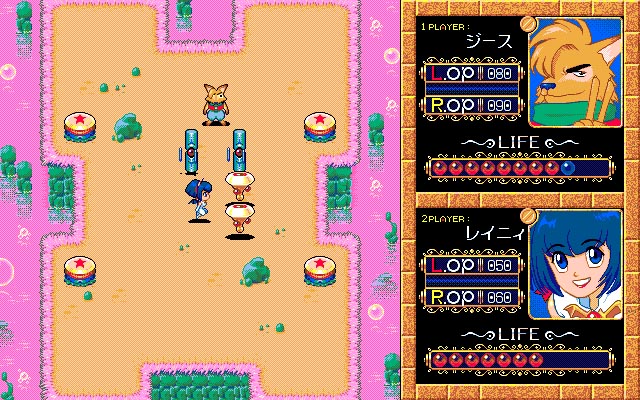 本作は1995年に発売されたブックタイプのDS#5に収録されていたアクションゲーム。プレイヤーは、ロボットのロビット、妖精族の生き残りのアンニャとメルクル、コウモリ族の王女レイニィ、熱血のキツネ族ジースから一人を選び、女神ヘスティアさまの祝福を受けるために、最強を目指すことになります。