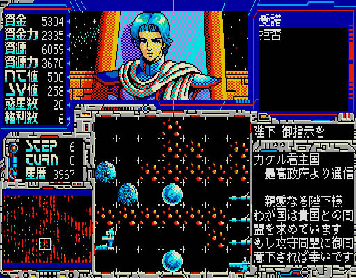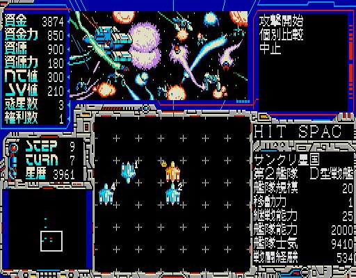 本作は1989年にリリースされたシミュレーションゲーム。プレイヤーは弱小サンクリ星国を育てながら全星団を統一するために奔走することになります。ゲームはターン制を採用しており、戦略モードでは兵器の開発や外交を行ない、戦闘モードでは最大4艦隊を率いて戦うことになります。