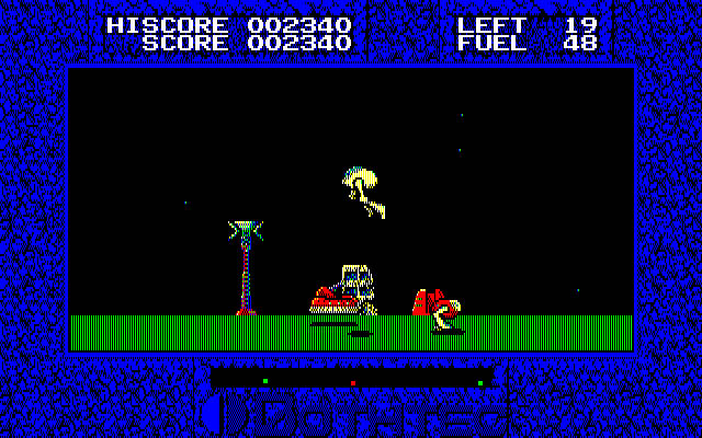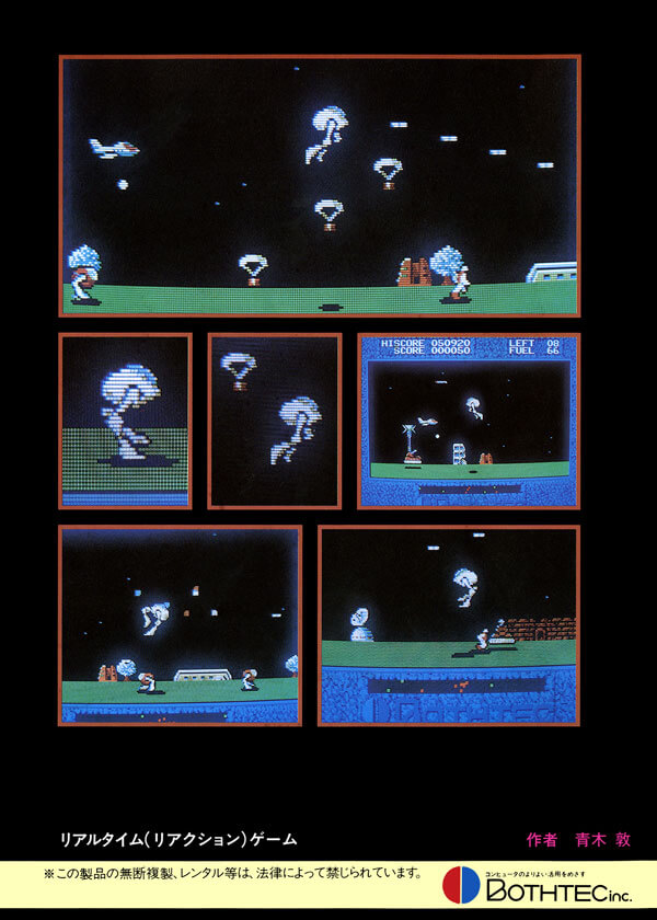 1985年にボーステックからリリースされた『EGGY』は、「ボーステック第1回プログラムコンテスト」優秀賞受賞作であり、惑星エギーを舞台に地球とガスプの戦いを描いたアクションゲームです。といっても激しいシューティングモノではなく、プレイヤーはボディアーマーのエナを操作して上空から飛来する物資を回収するという、ややおとなしめの内容。エナに搭載された武器は地上攻撃のみ、一度しゃがまないと飛行できない、飛行中には独自の浮遊感があるなど、少々個性的な仕様のため、実際のプレイでは敵の攻撃を避けることが前提となります。ちなみにゲームは全20ステージで、各ステージともに“一定数の物資が投下されるとクリアー”となります。なので物資を回収せずとも攻略できるので、プレイに慣れないうちは逃げ回って攻略し、慣れるにしたがって物資を回収してハイスコアを目指してもいいかもしれません。
