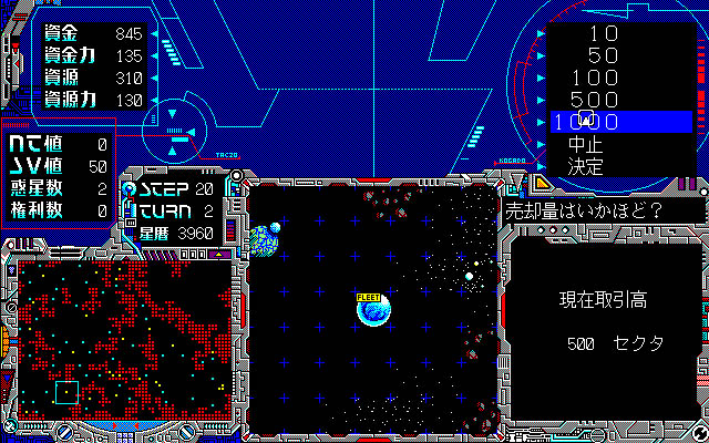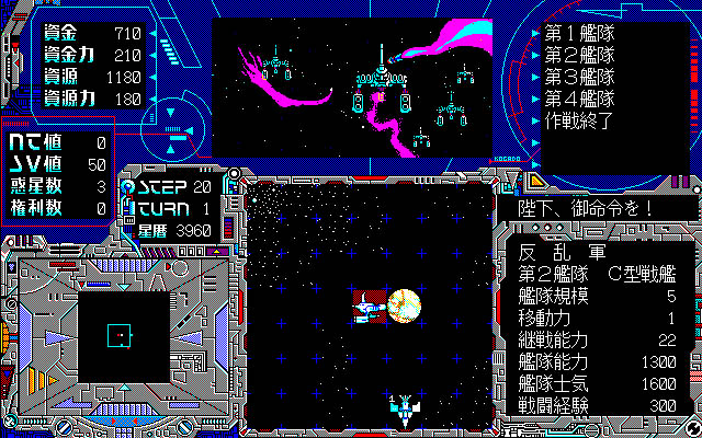 本作は1988年にリリースされたシミュレーションゲーム。プレイヤーは弱小サンクリ星国を育てながら全星団を統一するために奔走することになります。ゲームはターン制を採用しており、戦略モードでは兵器の開発や外交を行ない、戦闘モードでは最大4艦隊を率いて戦うことになります。