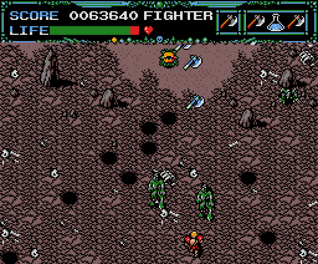 本作は1989年にリリースされた縦スクロールのアクションシューティングゲーム。プレイヤーは能力の異なる三人の主人公(Fighter、Wizard、Ninja)から一人を選び、6つのステージ(Forest、Cemetery、Ruins、Rocks、Cavern、Dungeon)から一つを選んで出撃します。