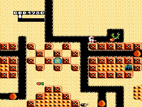 また、マップ上には、様々なモンスターが徘徊しており、注意が必要なほか、溶岩から一定時間身を守れるZスーツ、レーザー砲の射程が2倍になるルビー、穴掘り速度が2倍になるパワードリルなども登場、これらを上手に駆使して掘り進んでいきましょう。なお4つの鍵を集めて扉に向かえばステージクリアーとなります。