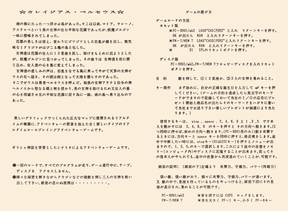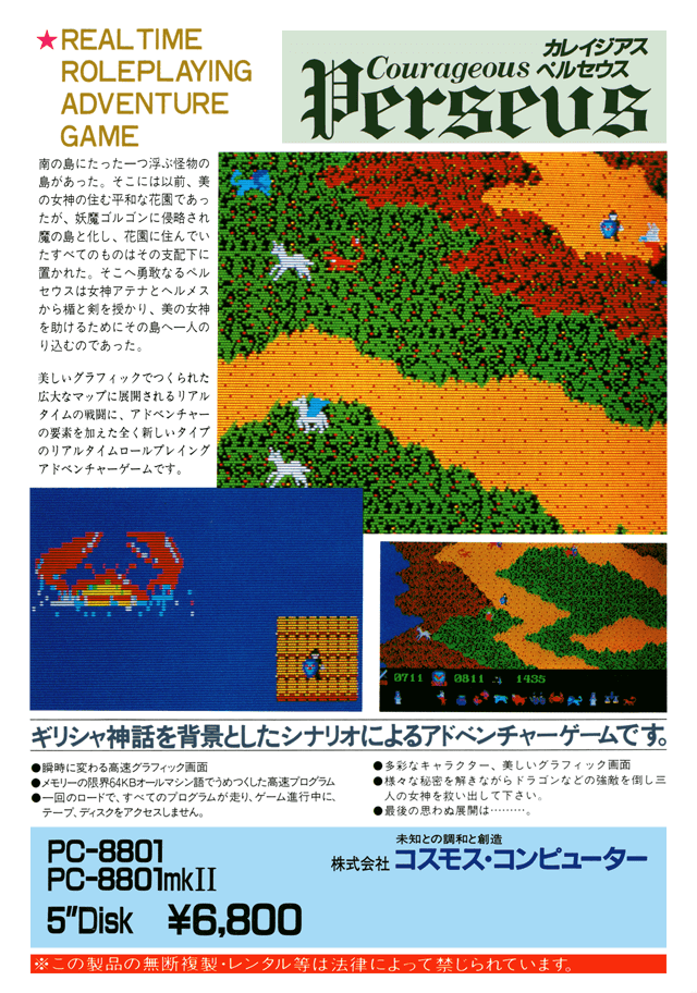 本作は1984年にリリースされたアクションロールプレイングゲーム。主人公は勇者ペルセウスとなって、ゴルゴンに支配された魔の島を舞台に、美の女神を救うための冒険をすることになります。