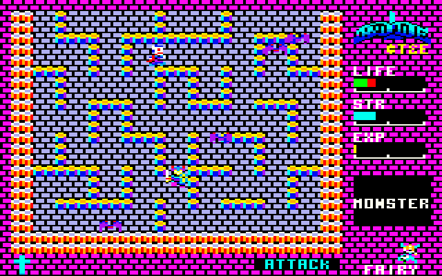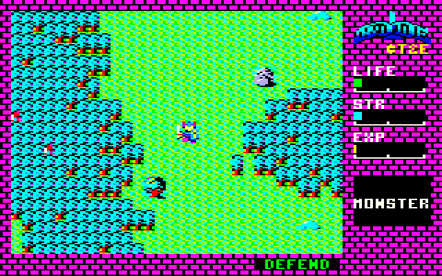 当時、アクティブRPGと称されていたことからもわかるように、本作ではアクション性がキモ。プレイヤーは攻撃モードと防御モードを切り替ながらジムをモンスターに体当たりさせて戦うことになります。モンスターを倒せは経験値が手に入り、経験値を溜めることでジムはレベルアップしてより強くなっていきます。またにジムが傷ついてしまったときは、平地などで休ませることで自動的に体力が回復する仕組みとなっています。