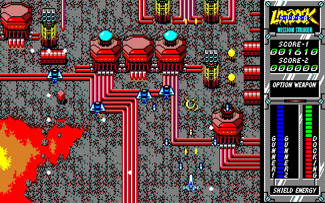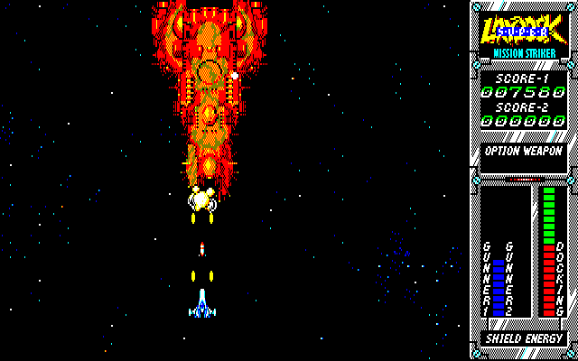 ゲームは全14ステージ構成。各ステージの終わりにはボスキャラが登場し、手に汗握る戦いが楽しめることでしょう。華麗なキーさばき(?)、メインショット、オプションウェポン、さらに二人プレイ時なら合体攻撃を駆使してギルセン軍との熱いバトルを堪能してください。