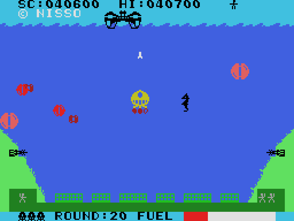 本作は1983年にリリースされたシューティングゲーム。プレイヤーは救助船を操作して海底都市へ人命救助に出発することになります。