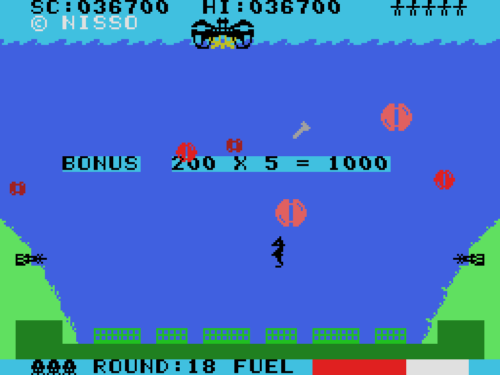 障害物を上手に回避し、海底都市へのミサイル攻撃にはバリアで対抗、さらに救助船の残りの燃料をチェックしつつ行動することもお忘れなく……。こうして5名の救助者を母艦に連れて帰ることができればステージクリア。シンプルなルールながらも、良い意味で忙しいゲーム展開が楽しめることでしょう。