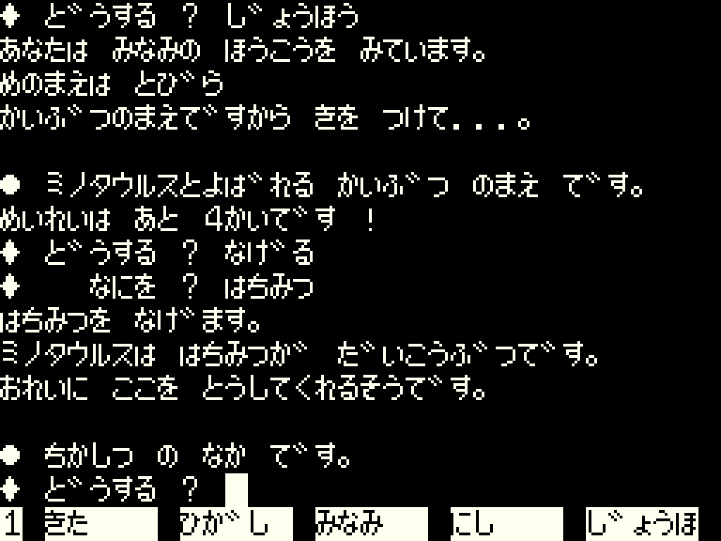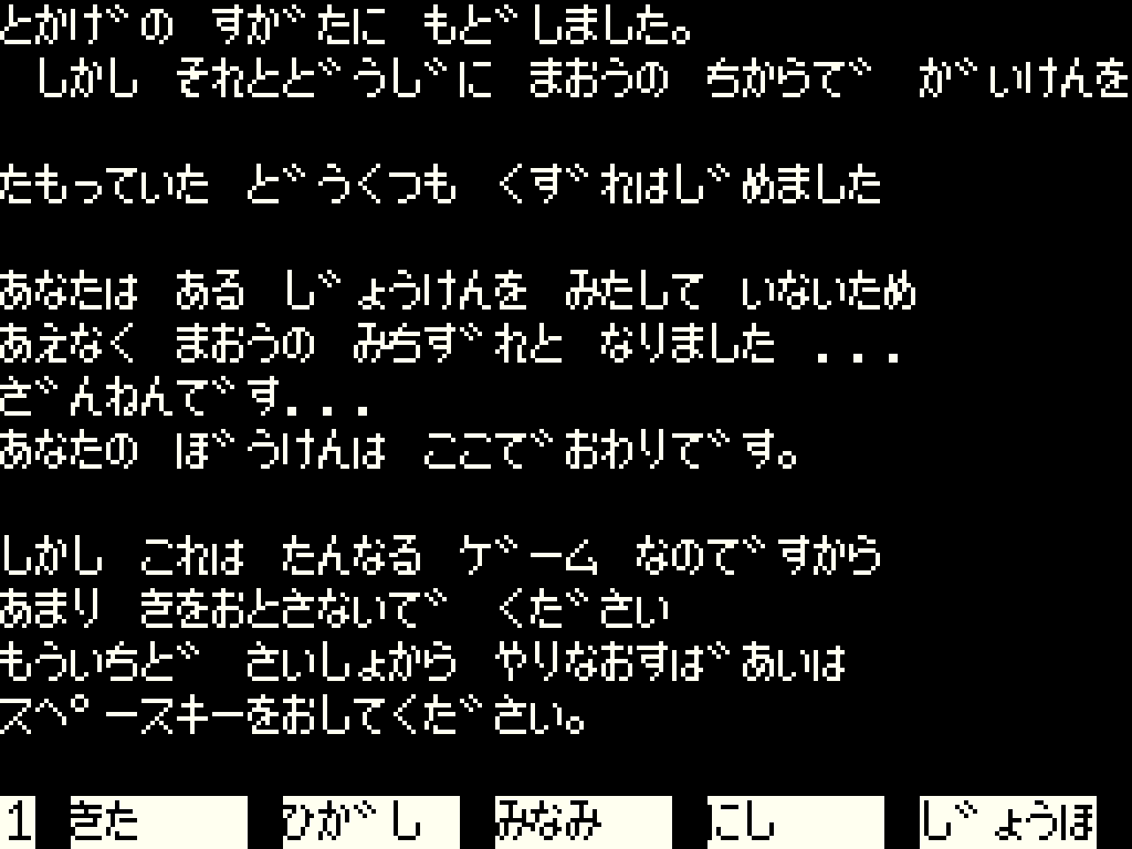本作は1983年にリリースされたアドベンチャーゲーム。プレイヤーは勇者となって魔王にさらわれたお姫様の救出に向かいます。ゲームはテキストアドベンチャーとなっていますが、一文字による短縮入力にも対応した親切設計(一文字入力の場合は、移動系コマンドの優先度が高いので注意)。ほかにも“ヒント”と入力することで単語集が表示できたり、“シホウ”や“ジョウホウ”と入力することで周囲の様子がわかるので、これらを上手く使ってゲームを進めてください。なお本作ではマルチエンディングを採用しており、ゲームの進め方によってエンディングが変化するため、何度も繰り返してプレイできます。
