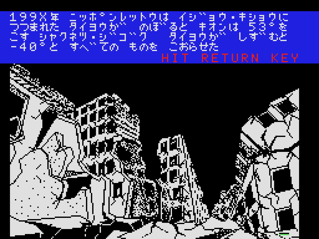 本作は1987年にリリースされたアドベンチャーゲームで、白と黒の伝説シリーズの百鬼編、輪廻転生編に続くタイトルです。今回も前作同様に、コマンド選択方式によるアドベンチャーゲームとなっていますが、サウンド面の強化や、描画はライン&ペイントから瞬時画像表示になったことで、より軽快で臨場感のあるプレイが可能となりました。