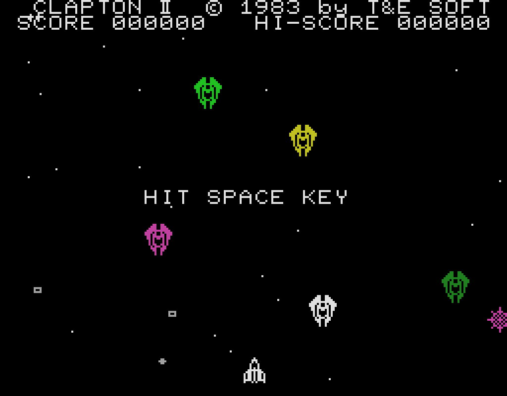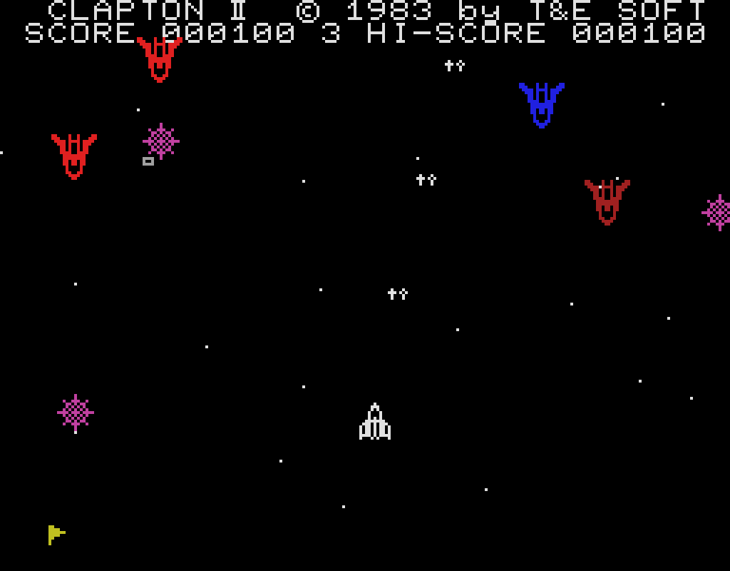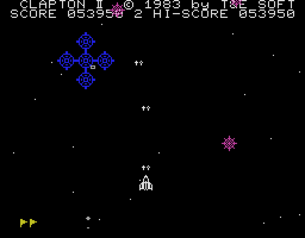 本作は1983年にリリースされたシューティングゲーム。プレイヤーは宇宙戦闘機クラプトンIIを操作して、迫りくる敵戦闘機と戦うことになります。敵や敵弾、機雷(?)に接触するとクラプトンIIを1機失い、残機がゼロになるとゲームオーバーとなります。