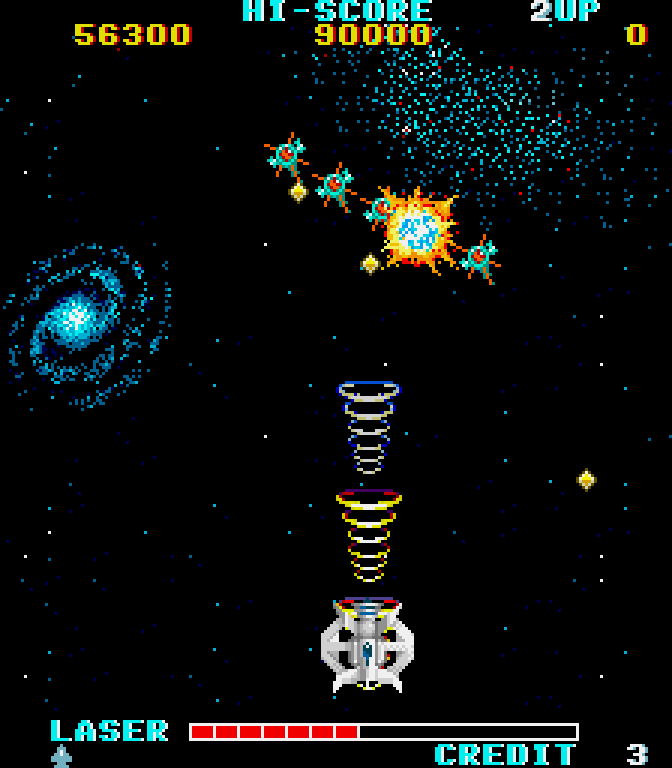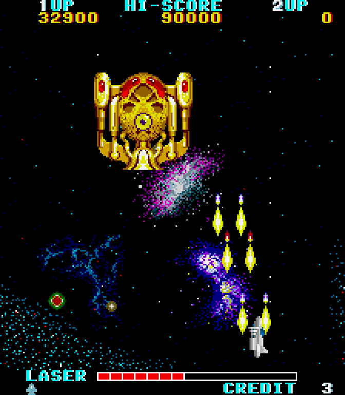 オリジナル版にあたる『アルファックスZ』と比較すると、背景・敵・アイテムといった見た目のアレンジにとどまらず、自機に慣性が働かなくなった、最初からツインショットになっている、サブウェポンがバリアからレーザーに変更されたなど、ゲーム性に関わる部分にも大きな違いが見られます。もちろん、オリジナル同様に、ほとんどの敵弾がショットで相殺できる点も健在なので、前述のレーザーや自機の操作しやすさなどを考慮すると、“より攻撃的なプレイが楽しめる”アレンジに仕上がっていると言えるでしょう。