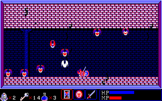 ゲームはサイドビューのアクションRPG。体当たりで敵を攻撃しつつ、様々なアイテム(魔法)などを駆使して敵と戦います。ちなみに敵との位置関係しだいですが、本作では真上の敵への攻撃をすることも可能。このテクニックは覚えておくと効率良く戦えるかもしれません。またゲームスピードを4段階に調節できるので、テンポの早いアクションはちょっと苦手かも……という人は自分の好みの速度でプレイすることもできます。