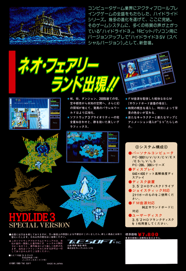 『3』は『2』から受け継がれたグラフィックやサウンドに加えて、攻撃が体当たりから攻撃ボタンに変更されるなどアクション性も向上しています。ほかにも職業選択、時間の概念、食事、アイテムの重量など、様々な要素がほどよく盛り込まれた意欲作といえるでしょう。さらに今回はSV(スペシャルバージョン)となって、ビジュアルシーン、新マップ、新キャラも追加。より楽しめる内容になっています。幅広いアクションRPGファンを唸らせた名作、ぜひチャレンジしてください。
