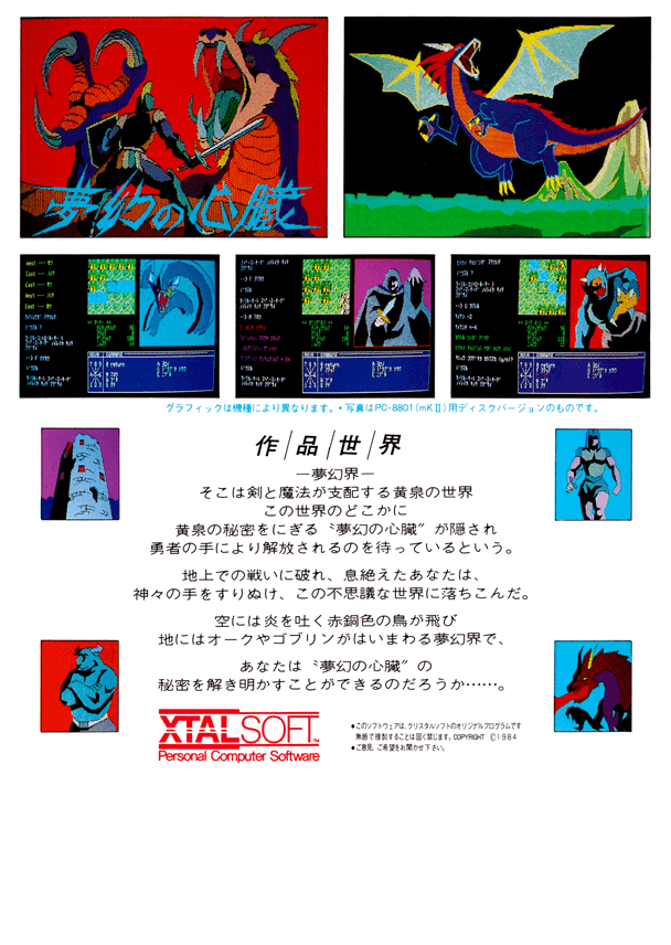 本作は1984年にリリースされたロールプレイングゲーム。プレイヤーは、天国でも地獄でもない夢幻界に落とされてしまった勇者となって、夢幻界から脱出するため、「夢幻の心臓」というアイテムを探す冒険をします。なお、冒険には期限があり、インゲームで3万日を超えるとゲームオーバーとなります。