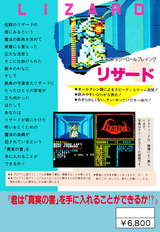 「姫に呪いがかけられた!」、国中はおおさわぎでした。大リザードと呼ばれる邪悪な心を持った者が、「真実の書」に記された魔法を悪用したのです。遠い昔に魔法の奥義が記され、この国をはるか離れた塔の中にまつられているという、この「真実の書」は、決して邪悪な心を持つ者が使ってはならないのです。 しかし、今恐ろしいできごとは起こってしまいました。もはや伝説の中でしか語られることのなかった「真実の書」を、今いちど正しき心を持つ者の手に返さなければなりません。 大リザードは、その伝説の古い塔に自らの分身として恐ろしい怪物を放ち、数々の魔法のワナを仕掛け、正しき心を持つ者をはばもうとしています。 姫のために立ち上がった若者、つまりこの物語の主人公であるあなたは数々の困難を打ち破り、みごと「真実の書」を手にし、姫にかけられた恐ろしい呪いを解くことができるでしょうか。
