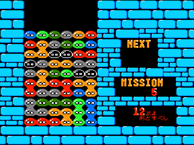 ゲームはMSX2版と同様に、ひとりでじっくり楽しむ「ENDLESS」、2人で対戦する「2PLAYER」、決まったお題を攻略する「MISSION」の3モードのほか、登場する“ぷよ”は6色、オプションで“ぷよ”の形状を「ヒューマン」型に変更可能です。一方で細かい点ですが、可視フィールドが13段目まであったり、色ごとに異なっていた“ぷよ”のデザインが統一されたりと、本作ならではの特徴もあります。