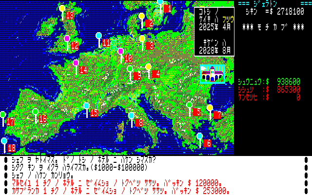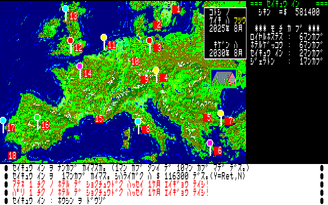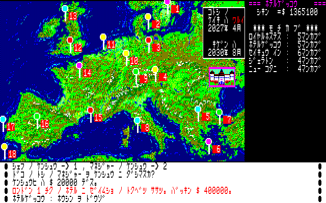 実際のプレイは、毎月コマンドを入力して進行。ホテル建設、シェフやマネージャーの雇用、ホテルの売買、株の売買、銀行からの融資といった、いかにもなコマンドが多数用意されており、これらを駆使して一大ホテルグループを目指します。また年ごとに景気が変動したり、月ごとにイベントやハプニングなども発生したりするため、ホテル経営はひと筋縄にはいきません。