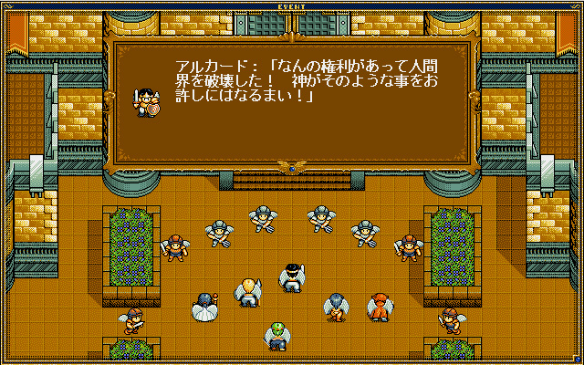 呉ソフトウェア工房が1995年に発売した、ファーストクイーンシリーズの流れを汲むシミュレーションRPG。 天界にその力を示すべく、バベルの塔を建設する大都市「ソドム」の人間たち。 だが天の者はその行いと思い上がりを怒り、人々を都市ごと地上から抹消した。 その攻撃によって愛する人を失った天使長アルカードと部下たちはソドム消滅を指示したもう一人の天使長、ミカエルに戦いを挑むが……。 装備や回復アイテム、キャラクター毎の役割の明確化と言ったお決まりの諸要素に加え、パーティメンバー一人ひとりがモンスターを召還し部隊を指揮できるなどゴチャキャラシステムもRPG風にアレンジすることで戦略性の高さはそのままに、ゴチャバトルとRPGの融合を実現した作品。