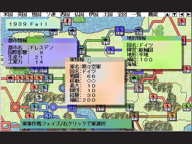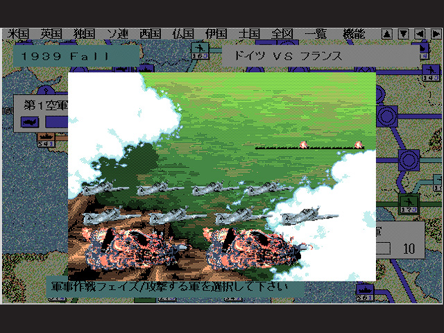 ドイツを中心とした枢軸国陣営とイギリスを中心とした連合国陣営に分かれ、政治的戦略を展開します。国際情勢を反映する国際世論、国民支持の概念を取り入れることにより、国際戦略と情勢判断が必要となるSLGです。 「統一=勝利」の概念を越えたシステムで、リアルな欧州大戦を繰り広げます。 欧州23カ国が登場し、時代を動かした「ドイツ」「ソビエト」「イギリス」「アメリカ」を選択することが出来、さらに4人までの同時プレイが可能。 MIDI音源にも対応した人気シミュレーションがEGGに登場。