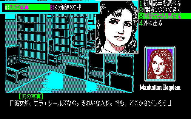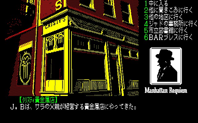 1987年にリバーヒルソフトから発売された推理アドベンチャーゲームです。 J.B.ハロルドシリーズ第2弾。物語はニューヨークのマンハッタンを舞台に一人の女性ピアニストの不審な死を調べるところから始まります。被害者はサラ・シールズ。彼女は自殺か他殺か?他殺なら誰が何のために殺したのか? はたしてJ.B.ハロルドは事件の真相を明かすことができるのか? FM−7版ではマウス操作にも対応していてスムーズにゲームを進めることができます。