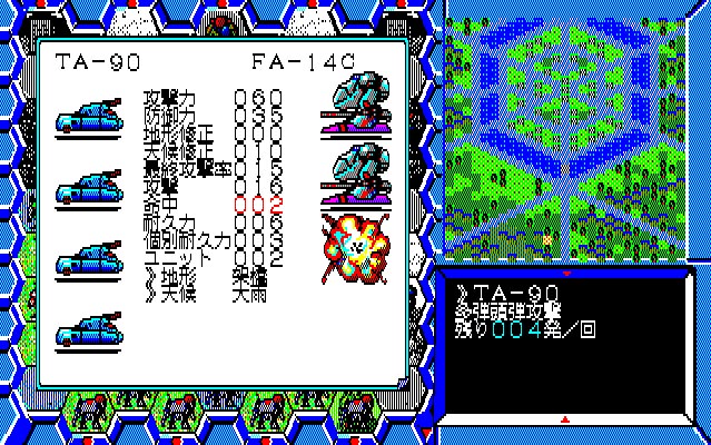 1989年に日本コンピュータシステム(NCS)より発売されたシナリオクリア型シミュレーションゲームです。 シナリオ開始前に与えられたポイントで自由に編成できるシステムは、【ガイアの紋章】でもおなじみのシステム。 今回の作品は、近未来の世界となっており、ファンタジーではなく、戦車等の兵器を使用する戦争SLGです。 戦争末期の植民地の自治権をめぐり数多くの内戦やクーデターが勃発し植民地の一地方だったバッカス半島では植民地前の国家を復興させるべく新たな気運が高まっていた。 ADと呼ばれる兵器を使った戦争を無事あなたは勝ち抜けるか。