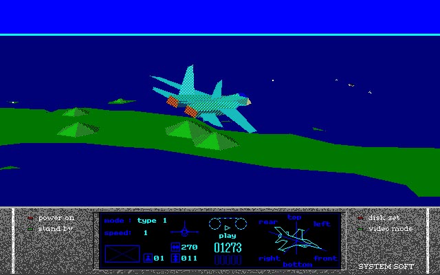 1991年にシステムソフトより発売された、『エアーコンバット遊撃王II』の続編です。 近年のフライトゲームと遜色の無い本格的で完成されたシステムと遊びやすさ、そしてより綺麗になったグラフィックが特徴です。 今回は前作の様なミッションクリア型ではなく、フライトモードでのリプレイをビデオ編集する事に重点を置いた内容。 コマ割りやアングル等を考え、さながらプロモーションビデオの様に制作する事も可能です。 魅せるシミュレーターとしての顔を如何なく発揮している一作ですが、もちろん土台となるフライトモードの各ミッションも難易度変更可能でやりごたえがあります。