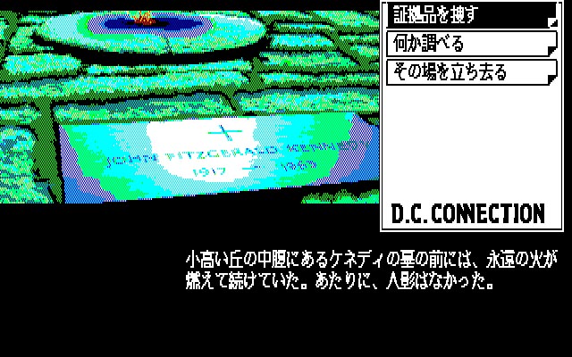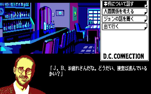 1989年にリバーヒルソフトからリリースされた『DCコネクション』は、『殺人倶楽部』(1986年)、『マンハッタンレクイエム』(1987年)、『殺意の接吻〜キスオブマーダー〜』に続く、刑事J.B.ハロルドシリーズ第四弾のアドベンチャーゲーム。ちなみにタイトル画面には3と表示されていますが、これは『殺意の接吻』が『マンハッタンレクイエム』のサイドストーリーであり、ナンバリングタイトルとしては、本作が“3”にあたるためです。