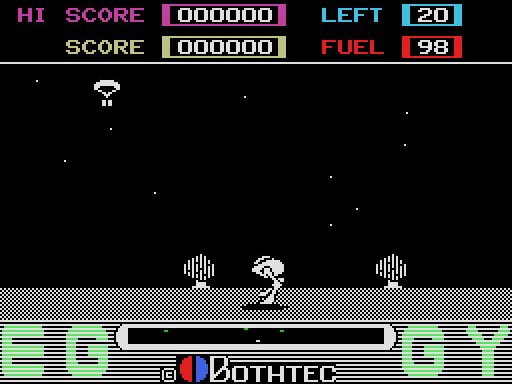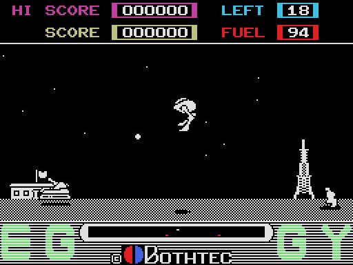 1985年にボーステックからリリースされた『EGGY』は、「ボーステック第1回プログラムコンテスト」優秀賞受賞作であり、惑星エギーを舞台に地球とガスプの戦いを描いたアクションゲームです。といっても激しいシューティングモノではなく、プレイヤーはボディアーマーのエナを操作して上空から飛来する物資を回収するという、ややおとなしめの内容。エナに搭載された武器は地上攻撃のみ、一度しゃがまないと飛行できない、飛行中には独自の浮遊感があるなど、少々個性的な仕様のため、実際のプレイでは敵の攻撃を避けることが前提となります。ちなみにゲームは全15ステージで、各ステージともに“一定数の物資が投下されるとクリアー”となります。なので物資を回収せずとも攻略できるので、プレイに慣れないうちは逃げ回って攻略し、慣れるにしたがって物資を回収してハイスコアを目指してもいいかもしれません。