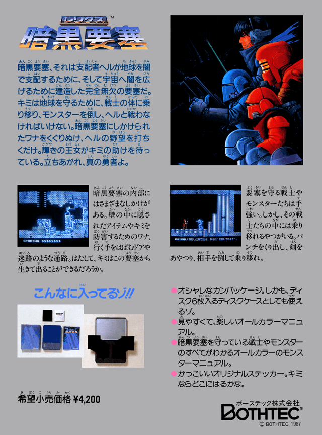 「レリクス」は、謎の遺跡を探索するサイドビューのアクションゲーム。最大の特徴は倒した敵に憑依できるという点で、状況に応じて様々なボディを駆使して進めるという独特のゲームスタイルは、多くのファンをとりこにし、PC-9801、PC-8801、FM-7、X1など様々な機種でリリースされました。そうした中で、同作の異端児とも言えるタイトルが、1987年4月10日に発売になった「レリクス 暗黒要塞」です。 これは、これまでにリリーされていた「レリクス」に大幅なアレンジを加えたタイトルで、ゲーム内容もオリジナル版と異なり、5つのアイドルを探し出して、暗黒要塞の最上階に潜むヘルを倒し、輝きの王女を救い出すというストーリーとなっています。 従来のレリクスファンであれば、どこか懐かしく、新しいレリクスの世界に満足できるかもしれません。 なおオリジナルの「レリクス 暗黒要塞」では、読み込みが頻繁に発生していたためにゲームの展開にもどかしい部分がありましたが、EGG版ではゲームの内容をそのままに、快適な動作が楽しめるように改良されています。
