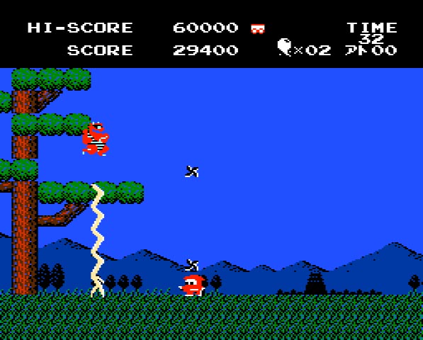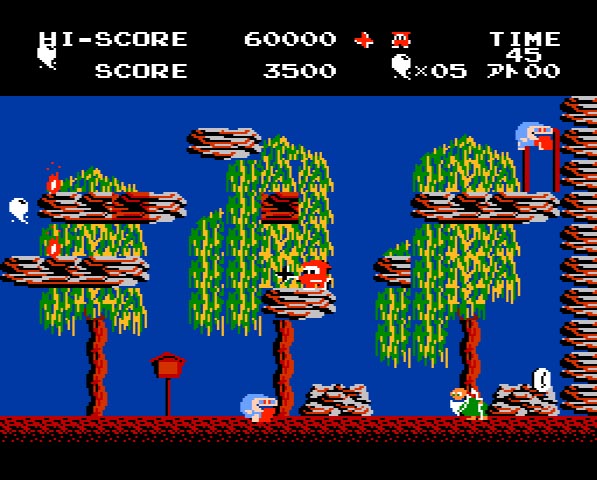 本作はジャレコより1985年にリリースされたサイドビューのアクションゲームです。プレイヤーはじゃじゃ丸くんを操作して、さくら姫を救出するために妖怪の巣窟を突き進んでいきます。要所では、虚無僧、カミナリパンツ、ザビエル、らしゃ面といった四天王との戦いがあるほか、ステージ10と20では忍法「ガマパックン」を使った、なまず太夫との決闘が待っています。ゲームは全20シーンで構成されており、さくら姫の救出はなかなかに困難ですが、手裏剣や忍法、各種アイテムなどを駆使して進んでいきましょう。