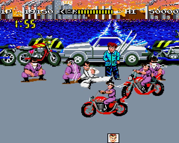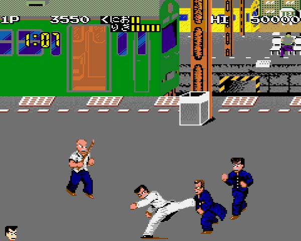 ゲームは制限時間アリのステージ制となっていて、“くにおくん”はパンチやキック、ジャンプ、ダッシュのほか、膝蹴り、背負い投げを駆使して敵と戦います。駅のホームや電車内で不良と戦い、湾岸での暴走族を相手に、ときにはディスコでスケバンを相手にし、最終的には暴力団と戦うという内容。オマケに最終ステージでは銃弾(命中すると即死)を避けながら戦うという過激さは、多くのファンを獲得することになりました。