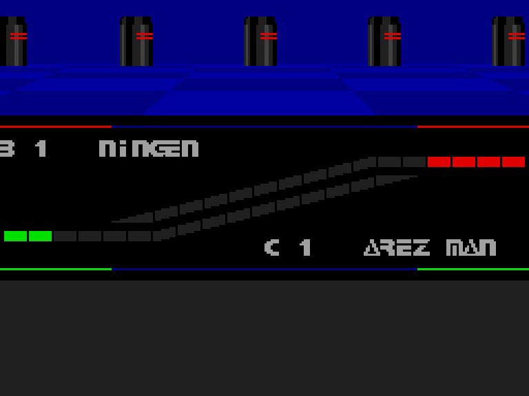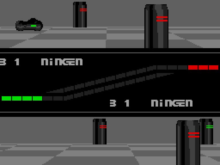当時としてはまだめずらしかった3Dフィールドを前後左右に動きまわり、自分の倒すべきポールを探しまわります。操作する機体は前進・後退し続けると加速してゆき、充分に速度が出たところでポールに体当たりするとポールを倒せますが、速度が充分でないと逆に跳ね返されてしまうので、要注意! また、バックミラーのような物もないため、自分の倒すべきポールがどこにあるのかを常に意識することと、相手がポールを倒しにくそうな配置を考えることが、本作攻略のポイントといえるでしょう。