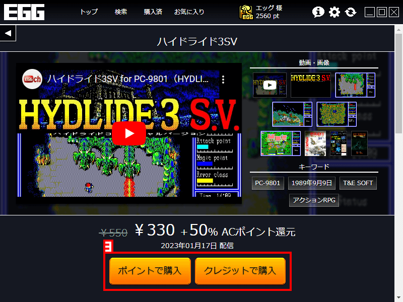 - 「ゲーム詳細」で「ポイントで購入」または「クレジットで購入」ボタンをクリックして商品を購入します。
