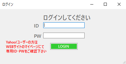 - yahoo!アカウントのユーザ様は、マイページでID・PW (パスワード) を確認してください。